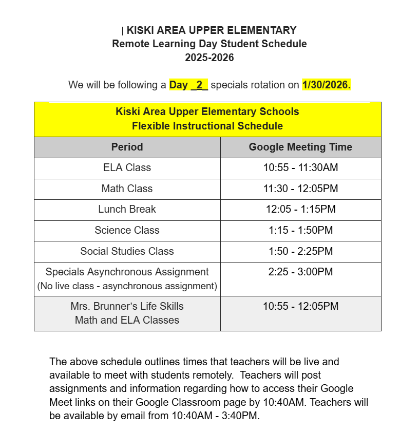 We will have a Remote Learning Day on Friday, January 30, 2026. Teachers will post assignments to their Google Classrooms by 10:40 AM, and live Google Meets will begin at 10:55 AM. Click here to access the schedule for the day, which is also posted on our school website. All teachers will be available by email from 10:40 AM – 3:40 PM should you or your child have any questions throughout the day. Thank you for your continued support, and we hope you have a safe, enjoyable, and productive day.