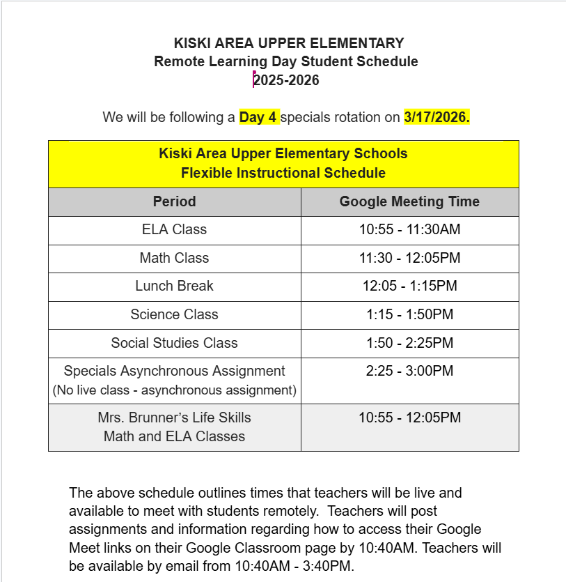 We will have a Remote Learning Day on Tuesday, March 17, 2026. Teachers will post assignments to their Google Classrooms by 10:40 AM, and live Google Meets will begin at 10:55 AM. Click here to access the schedule for the day, which is also posted on our school website. All teachers will be available by email from 10:40 AM – 3:40 PM should you or your child have any questions throughout the day. Thank you for your continued support, and we hope you have a safe, enjoyable, and productive day.